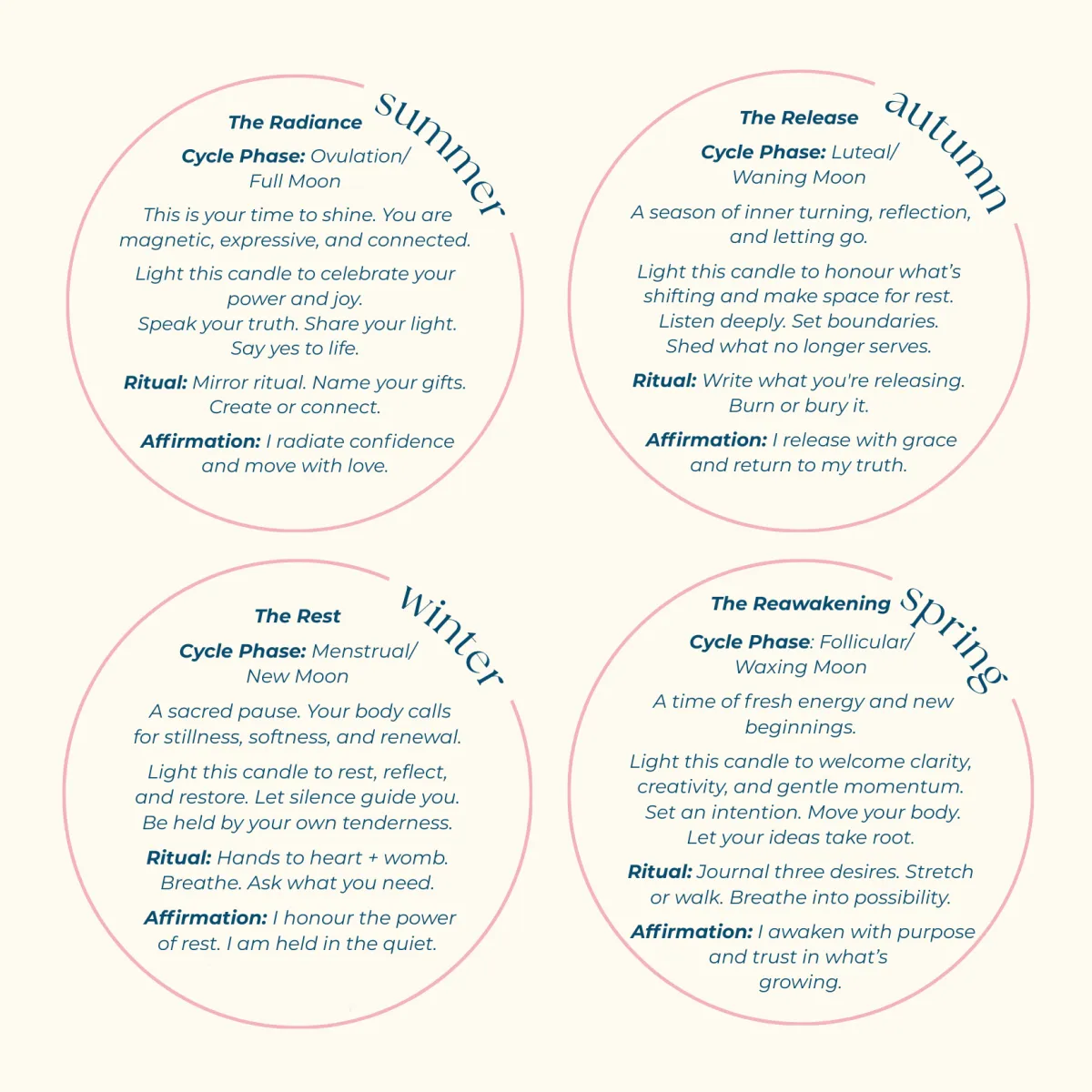 They’re designed to support cyclical living - a way of being that honours your energy, emotions, and essence throughout the natural ebbs and flows of life.